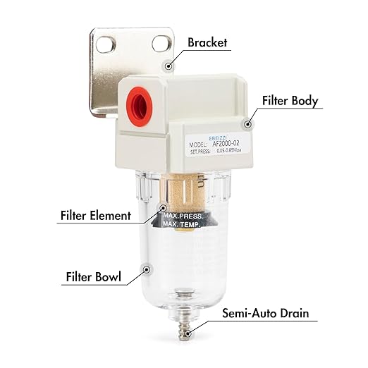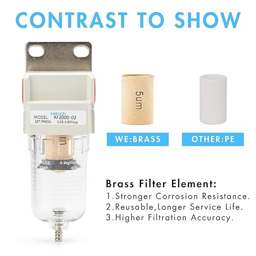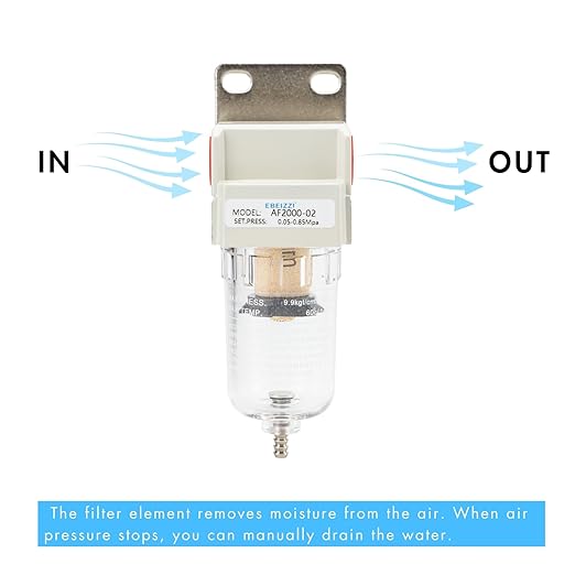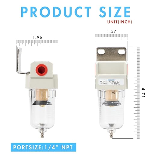 Q125.00 Secador de aire NPT de 1/4″ para compresor | Filtro de línea de aire comprimido Filtro de partículas NPT de 1/4″ Elemento filtrante de latón de 5 micrones, excelente rendimiento de filtrado, vida útil mucho más larga y factibilidad de reutilización Presión máxima de entrada: 145 psi; Presión de funcionamiento: 0-125 psi Rango de temperatura: 41-140 ℉ (41.0-140.0 °F); Caudal: 27 SCFM (750 L/Minuto) @ 90 PSI Drenaje semiautomático, cuenco y soporte de policarbonato, 2 accesorios NPT de 1/4″, 1 cinta de sellado de rosca. Enviamos a toda la republica pago contra entrega. Aceptamos tarjeta de crédito y debito.