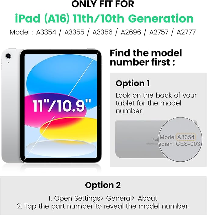 Compatibilidad: Solo se adapta a iPad (A16) 11ª/10ª generación 2025/2022 (11″/10.9″), (Modelo: A3354, A3355, A3356, A2696, A2757, A2777); verifique el número de modelo en la parte posterior de la tableta (A****) antes compra.