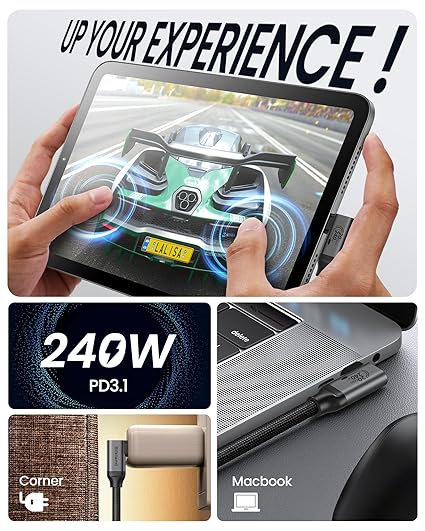 Velocidad de carga ultra de 240 W: nuestro codo de cable USB C a USB C soporta carga rápida de 240 W, 48 V/5 A. Adecuado para cargador de puerto USB C de 140 W/100 W/65 W/30 W. Carga rápidamente el iPhone 15 al 90% y el MacBook Pro al 88% en 35 minutos. También es compatible con la serie MacBook, iPad Series, iPhone 16/15 Plus/Pro/Pro Max, Google Pixel XL/2/2XL/3/3XL/3a/3a XL, Samsung Galaxy S21/ S21+/ S21 Ultra/ Note 10/Note 10 Plus/A80, Dell XPS 17, Huawei P60, Pixel 7 Pro, Surface Pro y más.
