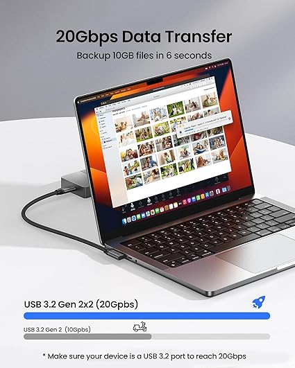 Transferencia de datos mejorada de 20 Gbps: este cable de datos USB C en ángulo recto cumple con USB 3.2 Gen 2 y puede enviar o recibir rápidamente películas HD, señales de audio y video 4K, haciendo una copia de seguridad de archivos de 10 GB en menos de 6 a 10 segundos. Admite conexión de puerto USB C hub, estación de acoplamiento, SSD y otros dispositivos de puerto USB C, como Samsung T9/T7/T5, SanDisk, SSK, Crucial X9 Pro, Rocket Nano V2, WD, etc. Plug and play, estar seguro y confiable.