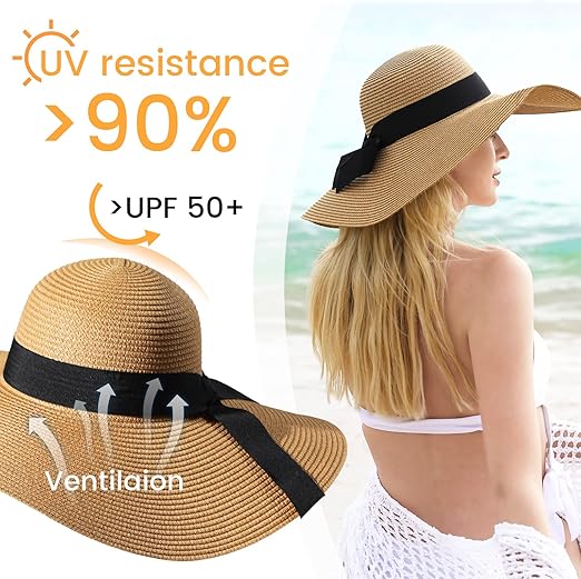 Q165 Sombreros de paja de playa para mujer, protección solar UPF 50+, ala ancha, sombrero de paja Tejido de paja de papel de alta calidad: tejido apretado que garantiza una alta durabilidad. Diseño ligero y transpirable. Lavar a mano solamente. Ala ancha para protección UV completa: diseñado con una ala ancha y flexible, este sombrero de playa para mujer proporciona una sombra perfecta a tu cara, ayuda a proteger contra la exposición directa a los dañinos rayos UV del sol y posiblemente previene las manchas de la edad, ¡mantén el fresco para siempre! Una banda interior para el sudor para ayudar a eliminar la humedad y garantizar tu máxima comodidad Cómodo de transportar: este sombrero de playa de ala grande tiene un diseño plegable para un fácil almacenamiento en un bolso o mochila cuando no está en uso, de esta manera ahorrarás mucho espacio. Vuelve suavemente a su forma después de ser plegado mediante humectación, vapor o utilizando una plancha. Enviamos a toda la republica pago contra entrega. Aceptamos tarjeta de crédito y debito.