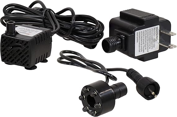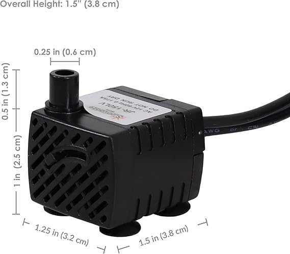 Para fuentes pequeñas o baños de pájaros: esta bomba de fuente de agua mide 1.5 pulgadas de ancho x 1.25 pulgadas de profundidad x 1.5 pulgadas de alto. Tiene un diámetro de manguera de 0.25 pulgadas y pesa 0.88 libras. Tiene un caudal de 40 GPH con una elevación de hasta 1.6 pies. Un cable de 21 pulgadas conecta las luces a la bomba.