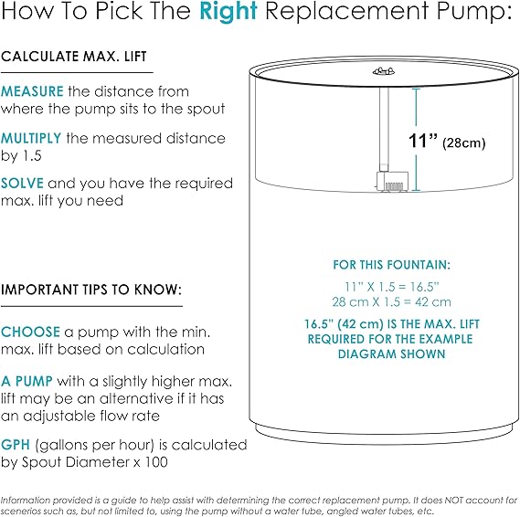 ENCUENTRA LA BOMBA DE TAMAÑO CORRECTO: Al elegir una bomba sumergible de repuesto, mida la distancia desde donde se encuentra la bomba dentro de la fuente hasta la boquilla. Multiplica la distancia medida por 1,5. Esto proporcionará la elevación máxima mínima que debe tener una bomba de reemplazo para operar con éxito la fuente (la elevación máxima se refiere a qué tan alto puede empujar el agua a través de un tubo recto). Si una fuente tiene un caudal ajustable, una bomba con una elevación máxima ligeramente mayor puede ser una alternativa.