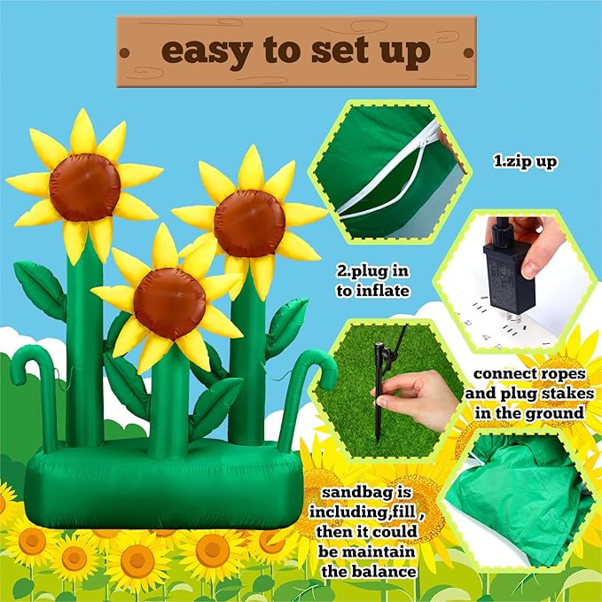 Q465.00 Syhood Decoración inflable de girasol de verano de 6 pies, flor inflable grande. Decoración inflable de girasol de 6 pies: esta decoración de primavera inflable de girasol se compone de tres girasoles, que es agradable para añadir un ambiente vibrante de verano a tu fiesta y es adecuada para el hogar, jardín, centro comercial, césped y otros lugares; puede decorar tu espacio y satisfacer tus necesidades de decoración Ilumina tus noches: las decoraciones de primavera inflables de flores están diseñadas con luces LED integradas, lo que garantiza que no solo sea una bonita decoración durante el día, sino que también se iluminen por la noche, asegurando que tu exhibición floral sea visualmente hermosa Decoraciones para exteriores: fabricada con poliéster 210T, la decoración de flores inflables promete un atractivo estético duradero y consistente, hecha para la longevidad y se puede plegar para almacenamiento una vez que termine la fiesta Fácil instalación, experiencia inolvidable: viene con motor, cable de alimentación, luz LED, bolsas de arena, tapones de tierra de plástico y cable de tracción; es cómodo y fácil de instalar este resorte inflable de 6 pies; simplemente llena los sacos de arena para estabilizar la flor, inflar, atar las cuerdas al suelo y enchufarlo Versátil y funcional: ideal para usar en patios, jardines, pasillos o centros comerciales, la decoración de primavera y verano puede revolucionar tu enfoque decorativo, su saturación de color brillante promete una hermosa exhibición dondequiera que se coloque. Enviamos a toda la republica pago contra entrega. Aceptamos tarjeta de crédito y debito.