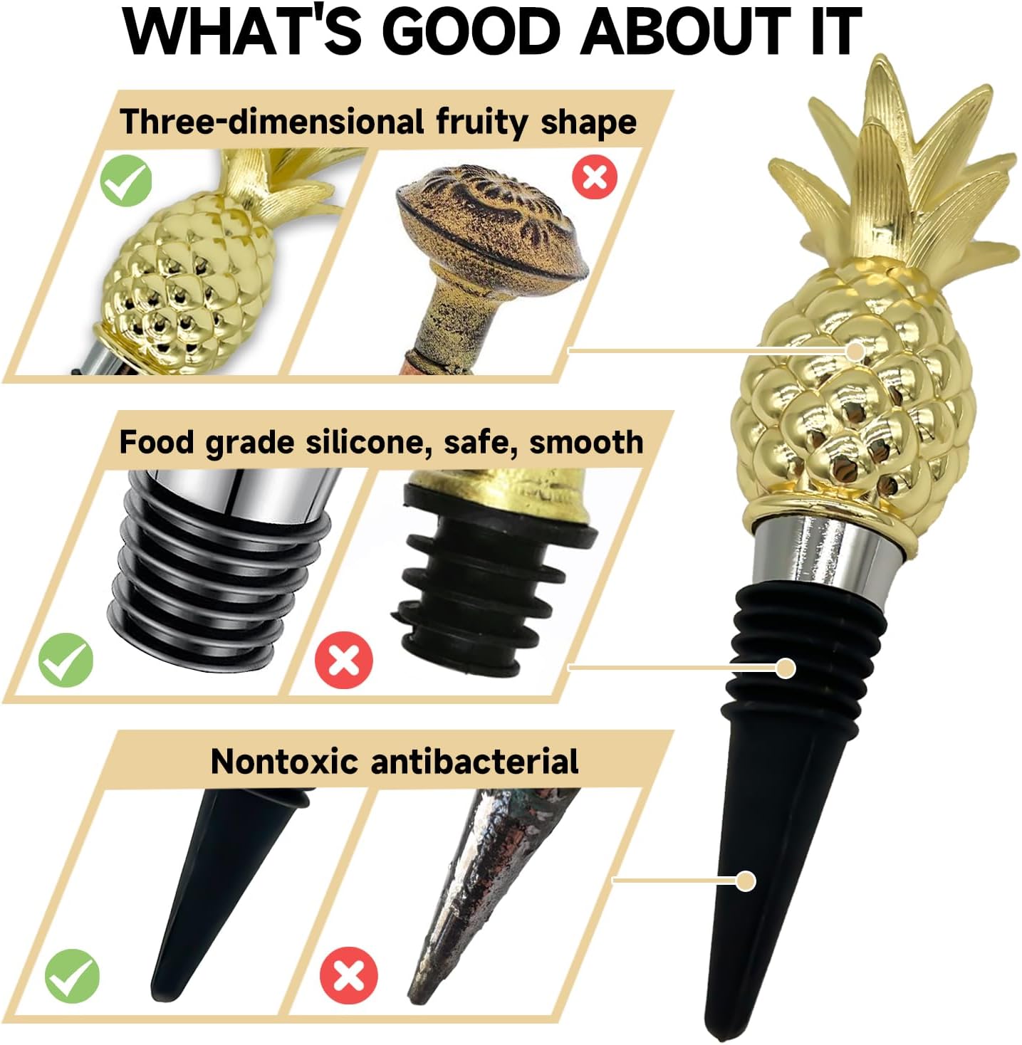 ☆[Diseño creativo de tapón de vino] Este tapón de vino ha marcado creatividad en comparación con el diseño tradicional de tapón de vino. Hay una piña dorada en la parte superior del tapón, añadiendo algo de diversión a tu gabinete de vinos.