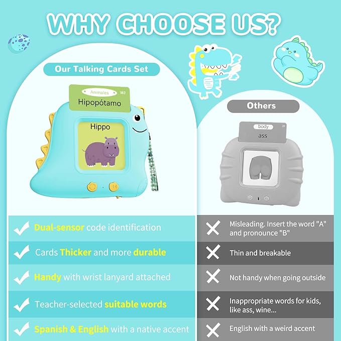 Q265.00 Tarjetas didácticas bilingües para hablar español/inglés, juguetes sensoriales de aprendizaje Juguetes de aprendizaje Montessori para niños: aprende español e inglés más fácil de una manera divertida. Este juego de tarjetas flash bilingües incluye 112 tarjetas con 224 palabras educativas tempranas. El contenido fue seleccionado por los maestros, lo que es más adecuado para que los niños aprendan. 14 temas que cubren vehículos, animales, necesidades diarias, alimentos, verduras, frutas, trabajos, colores y más. Un gran juguete de terapia del habla para ayudar a los niños en edad preescolar a mejorar sus habilidades lingüísticas y expandir su vocabulario. Dispositivo actualizado, aprendizaje efectivo: El contenido de palabras a la vista fue seleccionado por el maestro. No como otras marcas, incluido el vocabulario inapropiado. Y nuestras tarjetas son más gruesas y duraderas para que las usen los niños pequeños. No es fácil de dañar y doblar. Equipado con reconocimiento de código de barras de doble sensor, no te preocupes por los sonidos y las tarjetas no coinciden. Ofrece una correa de muñeca para fijar, conveniente para que los niños lo usen al aire libre, en el automóvil, viajes por carretera y avión. Grandes juguetes esenciales de viaje para personas pequeñas. Juguetes de terapia del habla multisensorial: buen juguete sensorial para niños pequeños con autismo, discapacidades no verbales o visuales. Las tarjetas combinan imágenes coloridas y sonido de audio, atrayendo a los niños autistas a reconocer e interactuar con cosas nuevas. También es una gran herramienta de aprendizaje para que los niños jueguen con sus familias. Algunas tarjetas sorpresa también registran el sonido simulado del objeto para hacer que el estudio sea más divertido. También mantiene a los niños alejados de teléfonos y tabletas, reduce el tiempo de pantalla de manera efectiva. Recargable y ligero: el lector de tarjetas flash ABC para niños pequeños viene con una batería recargable integrada de 300 mAh y se puede utilizar hasta 5 horas. Larga duración de la batería y entrará en modo de espera automático si 3 minutos inactivo. Peso solo 2.65 oz. Tamaño pequeño con 4.5 x 3.7 x 0.8 pulgadas, apto para niños. Fácil de sostener para manos pequeñas. Se proporciona un cordón de muñeca para mayor comodidad para llevar a cualquier lugar. Una bolsa de almacenamiento portátil para organizar las tarjetas y la máquina parlante. No te preocupes por las tarjetas perdidas. Gran regalo para los más pequeños: empaquetado con una bonita caja de regalo, regalo perfecto para cumpleaños de niños, Pascua, regreso a la escuela, Halloween, rellenos de Navidad y otras festividades. El bonito juguete de sonido de dinosaurio con tarjetas interactivas es adecuado para amantes de los dinosaurios, niños autistas y niños de desarrollo primario temprano. Se puede utilizar en casa y en clase. Juega con padres, maestros y amigos juntos para pasar un gran tiempo en familia. Enviamos a toda la republica pago contra entrega. Aceptamos tarjeta de crédito y debito.
