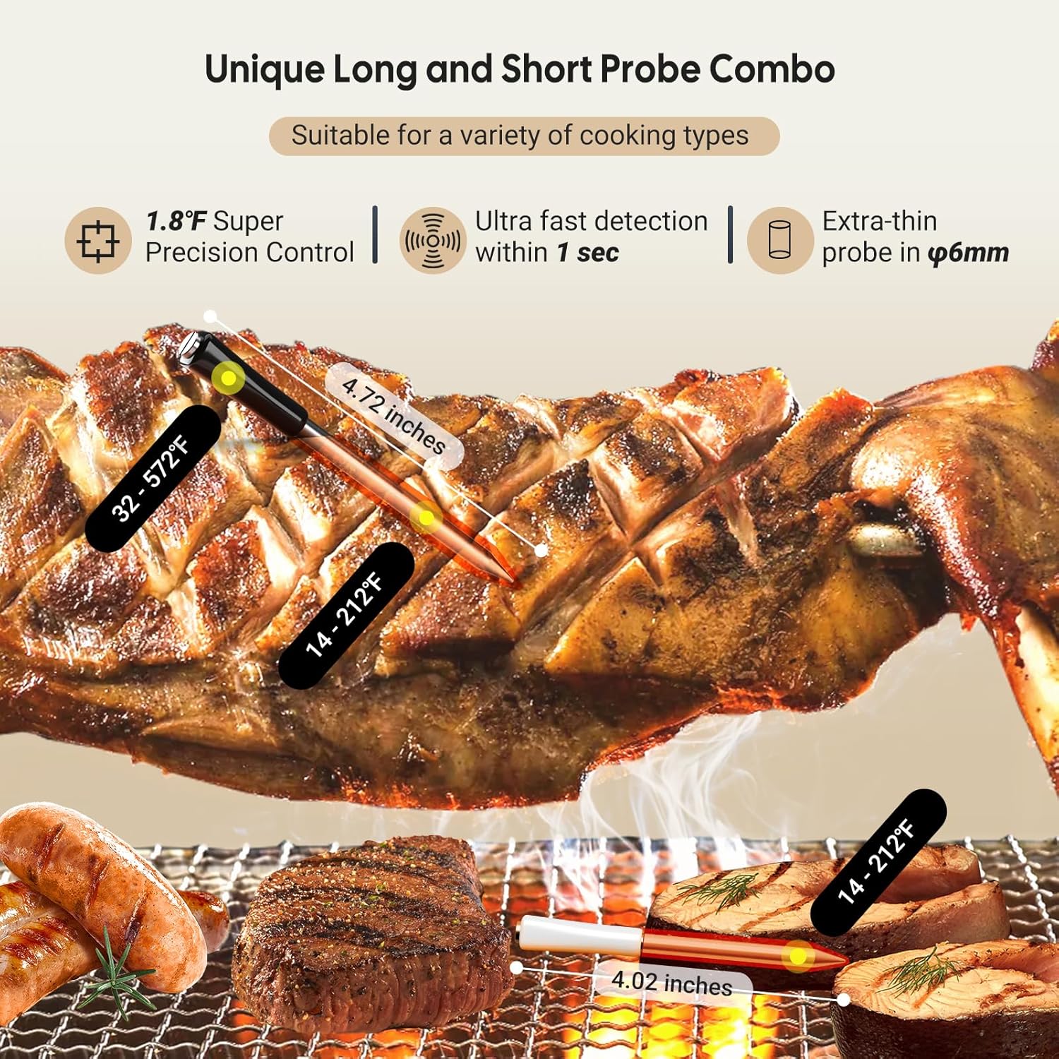 Sondas cortas de 4.72 pulgadas de largo y 4.02 pulgadas: sonda larga para filetes gruesos y sonda corta para peces delicados, apto para todo tipo de comida. La precisión de temperatura de estos termómetros digitales WiFi Bluetooth es de T ±1°C/±1.8°F de precisión y de ±12℉ de calibración para un monitoreo remoto preciso