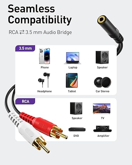 Q110.00 VCE Cable hembra de 0.138 in a 2 RCA macho estéreo de audio en Y, paquete de 2 Ajuste universal: permite que los dispositivos con una salida de audio de 0.138 in se conecten a sistemas de sonido con 2 entradas RCA. Garantiza un sonido claro con nuestro cable de audio RCA de 0.138 in a 2 para conectar tu tableta a un altavoz, teléfono a una barra de sonido o DAC a un tocadiscos Desata un sonido de cristal claro: disfruta de un audio estéreo rico y sin ruido con conectores chapados en oro y cobre sin oxígeno. El diseño blindado bloquea la interferencia; anillos de metal, escudos y bloqueos en sonido puro de doble canal Diseñado para mayor durabilidad: el conector RCA con punta dorada resiste la corrosión, mientras que el alivio de tensión y una cubierta de PVC suave y flexible mantiene el cable estéreo RCA de 1/8 pulgadas a doble a salvo de curvas, tirones y estrés diario AUDIO VERSÁTIL, USO BIDIRECCIONAL: Plug and Play con gran flexibilidad de entrada/salida. Ideal para cine en casa, coche, equipo de escenario o reuniones. Puentes bidireccionales de 0.138 in y RCA: conecta tu teléfono a un estéreo de automóvil o TV a altavoces. Disfruta de un sonido claro y sin pérdidas en cualquier lugar LO QUE OBTIENES: 2 cables de audio hembra de 0.138 in a 2 RCA macho (8 pulgadas) con textura antideslizante en los enchufes RCA para un agarre seguro, asegurando que no haya pérdida de calidad en largas distancias. Diseño compacto y portátil para configuraciones sobre la marcha, además de soporte posventa de 18 meses Enviamos a toda la republica pago contra entrega. Aceptamos tarjeta de crédito y debito.