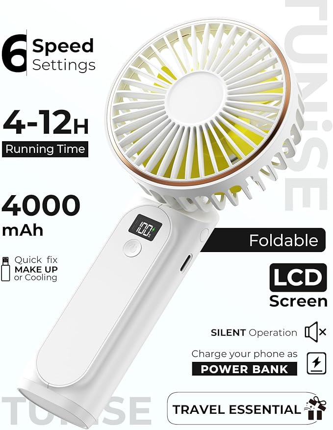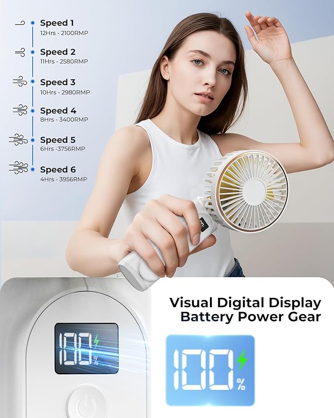 Tiempo de trabajo superlargo: ventilador de mano, batería de larga duración y recargable, batería de gran capacidad de 4000 mAh, puede funcionar continuamente durante 4-18 horas (dependiendo del equipo), y solo tarda 1.5 horas en cargarse completamente.