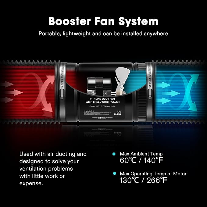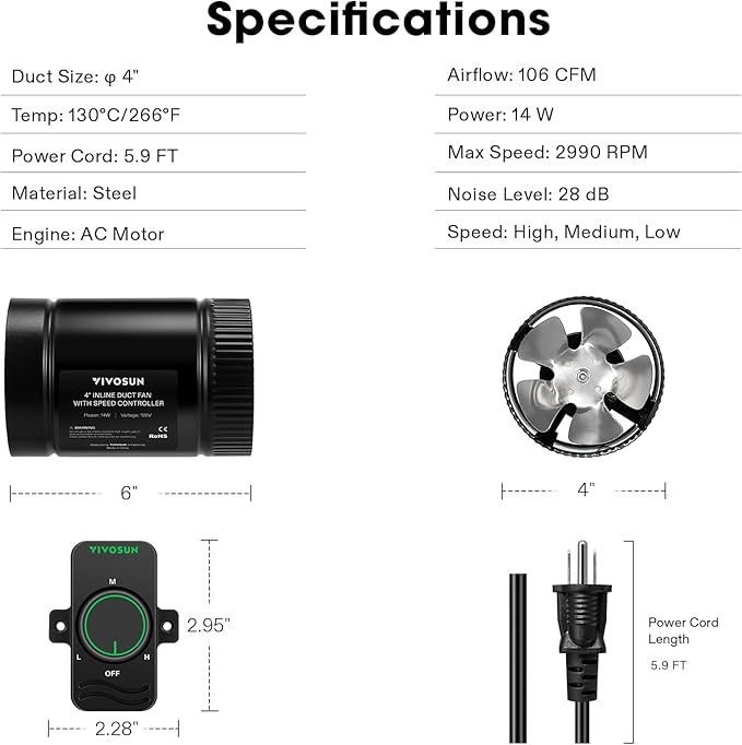 Q385.00 VIVOSUN Ventilador de conducto de refuerzo en línea de 4 pulgadas 106 CFM. Duradero: el ventilador tiene un motor fuerte que cuenta con un rodamiento lubricado permanentemente que funciona silenciosamente y no requiere mantenimiento; la carcasa de acero de calidad lo hace resistente y construido para durar Velocidad ajustable: un controlador de velocidad variable en el cable de alimentación permite que el ventilador funcione a diferentes velocidades; con este interruptor de velocidad, puede ajustarlo al nivel de flujo de aire deseado Compacto pero eficiente: este ventilador de conducto es lo suficientemente compacto y ligero como para instalarse en áreas con poco espacio disponible; con un diámetro de 4 pulgadas, velocidad de 2990 RPM y flujo de aire de 106 CFM Bajo nivel de ruido: impulsor centrífugo equilibrado superior para una larga vida útil y un funcionamiento silencioso; Un nivel de ruido de menos de 28 dB no tiene ningún daño y no molestará su vida Amplias aplicaciones: puede tenerlo en baños, cocinas, talleres, sótanos, áticos, etc., para aumentar el flujo de aire en los sistemas HVAC; Además, se puede utilizar en salas de cultivo como ventiladores de admisión o extractor Para mantener un rendimiento óptimo del extractor, limpie el ventilador después de la primera semana de uso con el filtro de carbón conectado y luego límpielo regularmente según las condiciones de uso Enviamos a toda la republica pago contra entrega. Aceptamos tarjeta de crédito y debito.