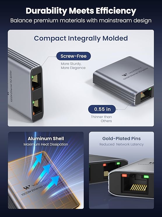 Diseño ligero con características robustas: ahorra espacio y es fácil de llevar con ultra delgado de 0.55 pulgadas. Fabricado con una carcasa de aluminio moldeada integralmente que garantiza una disipación de calor excepcional, nuestro divisor Ethernet cuenta con un diseño sin tornillos que ofrece durabilidad y moda. El puerto RJ45 estándar está equipado con pines chapados en oro, lo que garantiza una transmisión de datos fluida, lo que le permite navegar por diversas actividades de red sin problemas.