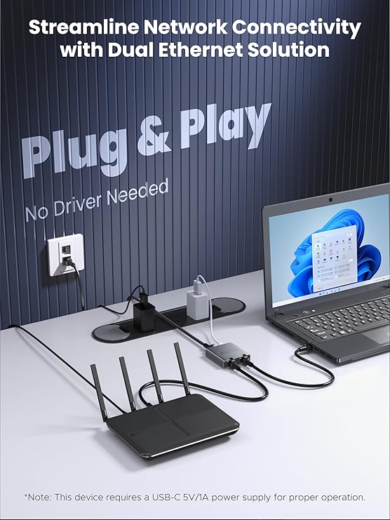 [Plug-and-Play y compatibilidad universal] Simplemente conecta una fuente de alimentación de 5 V/1 A al puerto USB-C del adaptador y disfruta de una experiencia Plug & Play sin la necesidad de instalación del controlador. La funcionalidad fácil de usar lo hace conveniente para cualquier persona, compatible con varios modelos de cables Ethernet (Cat 5, 5e, 6, 7 y 8), y funciona perfectamente con enrutadores, conmutador de red, PC, laptop, consola de juegos, impresora, DVR, etc. (*Nota: No funciona sin alimentación alimentada).