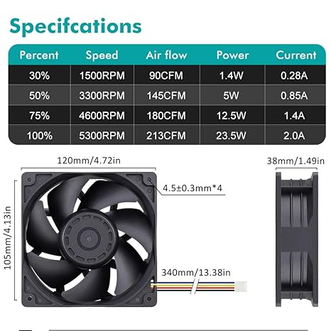 Q385. Wathai 12038 4.724 in x 1.496 in PWM PC PC Case Fan 12V 4pin 5300rpm 230 CFM alto flujo de aire doble bola CFM FG DC ventilador de refrigeración sin escobillas Dimensiones: 4.724 x 4.724 x 1.496 in (4.72 x 4.72 x 1.5 pulgadas) | Tensión nominal: 12 V 2.0 A | Ruido: 60 dBA (máx.) | Flujo de aire: 230 CFM | Potencia: 22.8 W | Velocidad: 5300 RPM | Presión de aire (en H2O) ): 1.17 ; 1 ventilador incluye parrilla de ventilador y tuercas de tornillos de montaje Los rodamientos de doble bola tienen una vida útil de 67.000 horas y permiten que los ventiladores se coloquen planos o se mantengan en posición vertical. El ventilador de caja de 4.724 in está diseñado para maximizar el flujo de aire y puede ser demasiado alto a toda velocidad para algunas aplicaciones Alta velocidad: ventilador de alta presión estática de 4.724 in diseñado para proyectos que requieren refrigeración o ventilación; o como ventilador de reemplazo para varios productos como carcasa antminer, PC de juegos y plataforma de minería, carcasa de computadora Conector: 4PIN; (+): Cable rojo; (-): Cable negro. Función FG: Cable amarillo; PWM: cable azul; ventilador de 4.724 in de alto cfm diseñado para mineros, compatible con chasis antminer y chasis de GPU de servidor Ventilador de computadora de alto CFM: ventilador PWM de 4.724 in regulación inteligente de velocidad, es decir, cuando se alcanza una cierta temperatura, se aumentará la velocidad. Puede ingresar al BIOS para establecer la temperatura del disparador. Se puede configurar el funcionamiento del porcentaje del ventilador. Enviamos a toda la republica pago contra entrega. Aceptamos tarjetas de credito y debito.