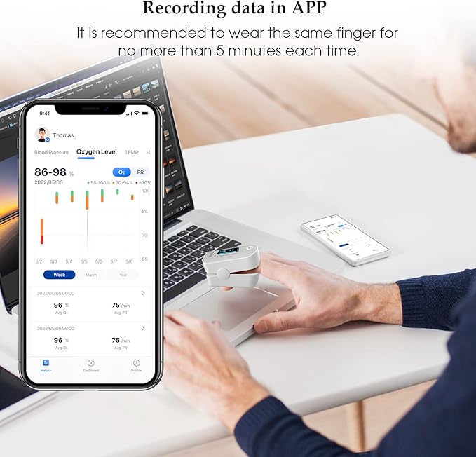 APLICACIÓN GRATUITA PARA ANDROID E iOS – Utilice la aplicación sin costo adicional. Grabe y almacena una lectura de hasta 10 horas continuamente. (SÓLO registre cuando la aplicación se está ejecutando) Ver datos en tiempo real, informe gráfico y tendencias del nivel de sangre 02 y frecuencia del pulso.