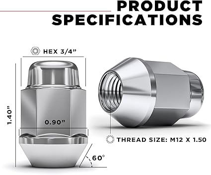Q285.00 White Knight – Tuerca en forma de bellota, cromada, M12x1.50, 20 unidades (paquete de 1). Para llantas de refacción y de fábrica seleccionadas. Especificaciones: paso de rosca M12 x 1.50, altura total de 1.40”, diámetro de 0.90”, hexágono de 3/4″, asiento cónico de 60°, tipo bellota abultada. Características: acero de carbono forjado en frío y probado conforme a los estándares de la industria. Construcción resistente. Acabado cromado o cromado negro de estilo elegante. Utiliza el diseño tradicional de tuerca con cuerpo hexagonal y cónica abombada para una instalación rápida y fácil. Aviso: consulte el manual del propietario o la guía del fabricante de la llanta para conocer el tamaño correcto de la rosca, el estilo del asiento, la longitud, el hexagonal y las especificaciones de torque (idioma español no garantizado). Usted asume toda la responsabilidad de una instalación incorrecta que puede resultar en accidentes y/o lesiones. – Comprueba siempre el ajuste de tu vehículo antes de comprar. Enviamos a toda la republica pago contra entrega. Aceptamos tarjeta de crédito y debito.