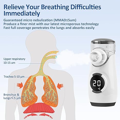 - Compacto y portátil: el kit viene con un nebulizador, dos tamaños de máscaras, una boquilla, un cable de alimentación USB-C de 60 pulgadas, una guía rápida e instrucciones. Los nebulizadores de malla están diseñados típicamente para ser compactos y ligeros. Las personas pueden llevarlos en una bolsa o bolso, asegurando que tengan acceso a su soporte respiratorio dondequiera que esté.