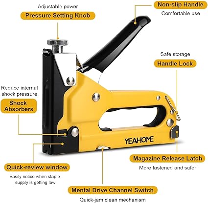 Q225.00 YEAHOME – Pistola grapadora 4 en 1 con 4000 grapas, grapadora manual para madera, manualidades. Herramienta de fijación versátil: la pistola de grapas 4 en 1 de YEAHOME acepta grapas en forma de D, en forma de U, en forma de T y en forma de pin. Este kit viene con 1000 clavos de cada tipo D, tipo T, tipo U y pines para una amplia variedad de aplicaciones: reparaciones generales de bricolaje, manualidades, decoración, proyectos de tapicería, techos, y mucho más. Pistola grapadora resistente: cuenta con toda la construcción de acero cromado y un acabado cromado para proporcionar resistencia y durabilidad, y hacer que la grapadora sea resistente al óxido. Las grapadoras YEAHOME están montadas con fuerza para que pueda soportar la carga dura y durar tanto como lo necesites Ajuste de potencia: cambia la presión (entre baja a alta) con la palanca de tornillo según el requisito de tus proyectos, para grapar en materiales blandos y duros, hace que tus proyectos sean más fáciles. Fácil de usar: mango de acero con agarre sobremoldeado para ayudar a proporcionar un uso cómodo y fácil operación. Diseño de carga inferior y un cargador de acero para una carga rápida y fácil. Información: Viene con un manual de usuario (idioma español no garantizado). Enviamos a toda la republica pago contra entrega. Aceptamos tarjeta de crédito y debito.